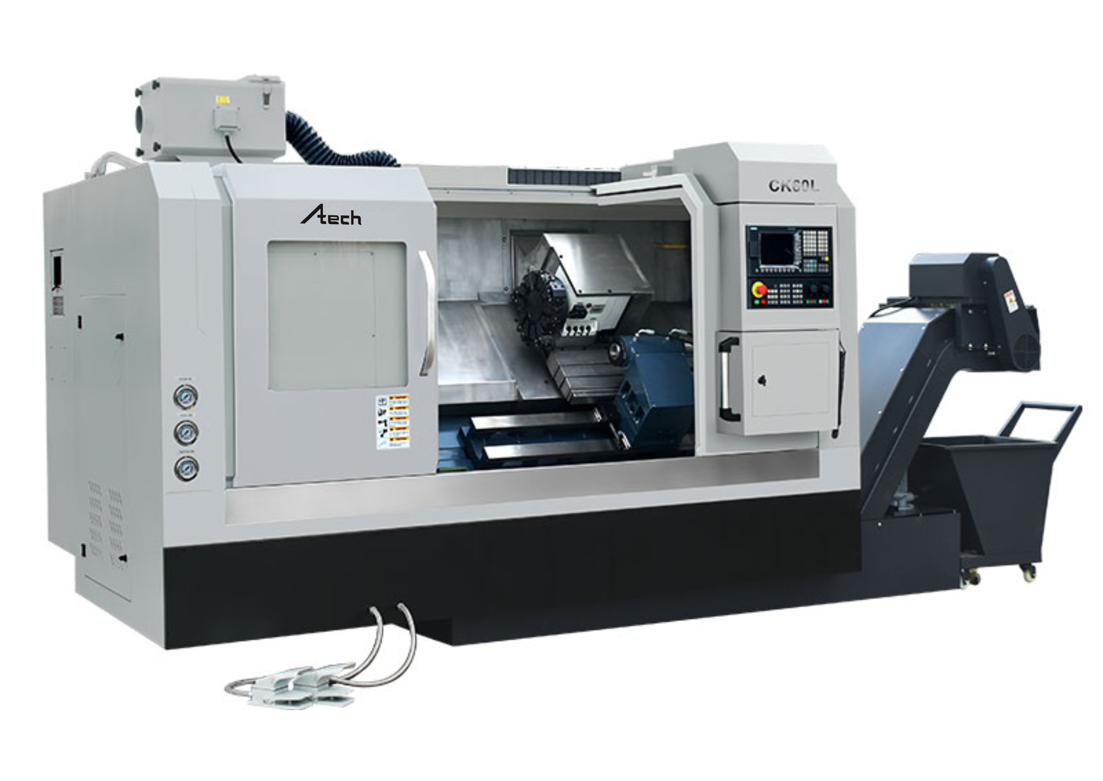 - High precision slant CNC lathe with Taiwan screw & linear guideway.
